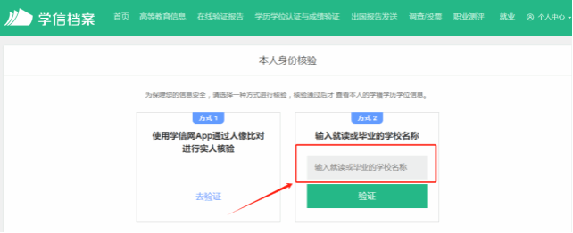 第五步,提示本人身份核验:一般选择方式2:“输入就读或毕业的学校名称”——输入学校名称“太阳集团”