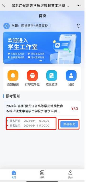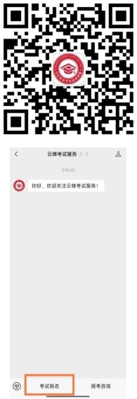 1. 学生微信需关注北京网梯学位外语考试服务公众号,进入对话界面,下方点击考试报名: