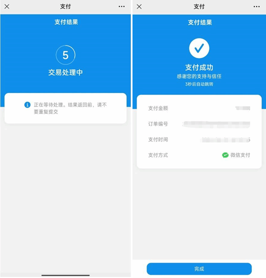 6. 选择微信后,点击下方确认支付按钮,输入支付密码进行支付,等待支付结果,成功后自动显示支付成功界面。