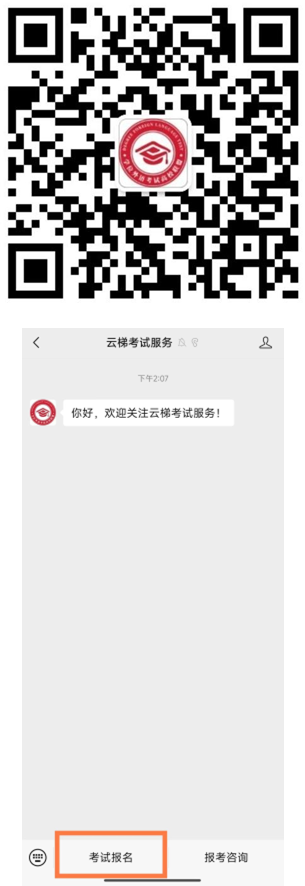 1. 学生微信需关注北京网梯学位外语考试服务公众号,进入对话界面,下方点击考试报名:
